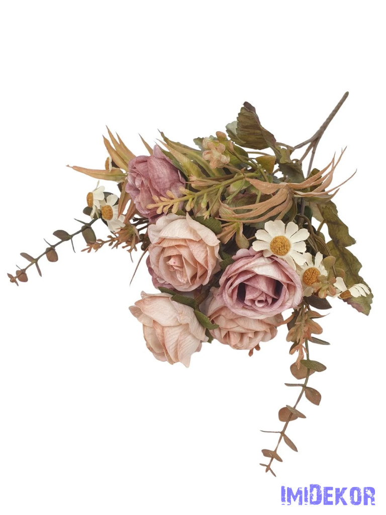 Antik színű rózsa + kis virágos csokor 29cm - Antik Barna