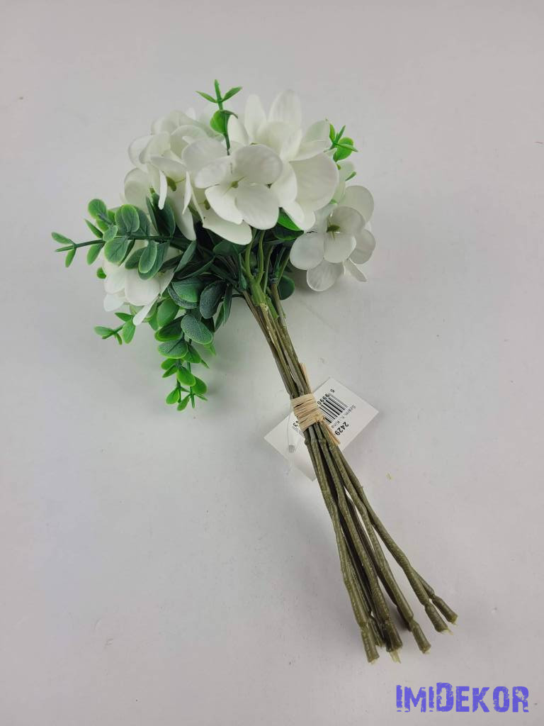 Hortenzia 10 ágú köteg mű eukaliptusszal 25cm - Törtfehér