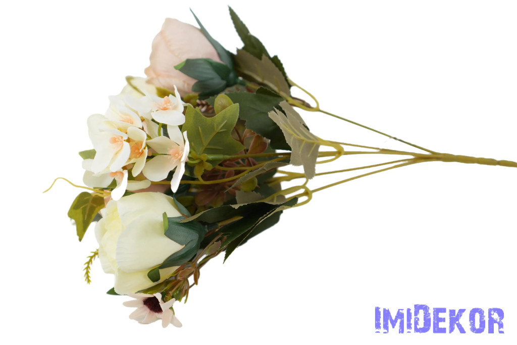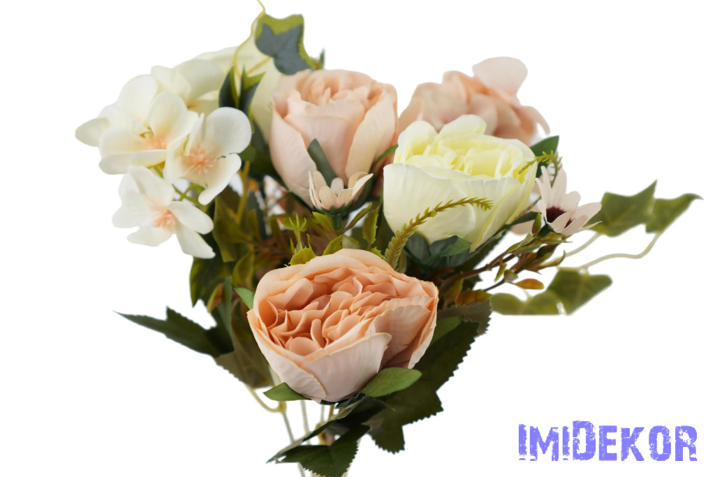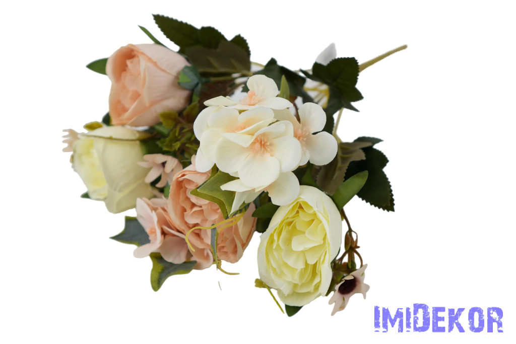 Peónia + hortenzia 6 ágú selyemvirág csokor 31cm - Krém-Barack