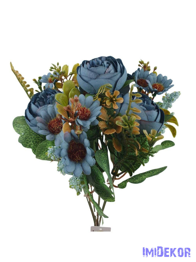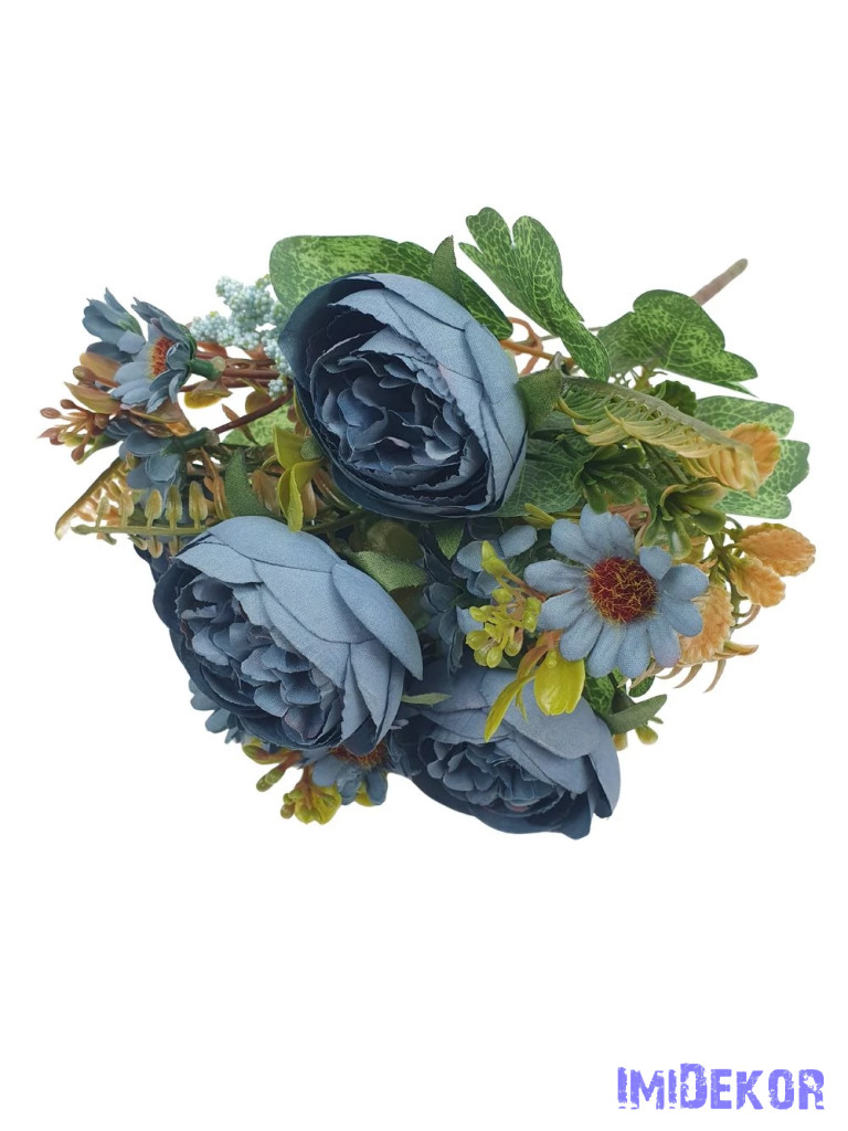 Peónia selyemvirág csokor kiegészítőkkel 35cm - Kék