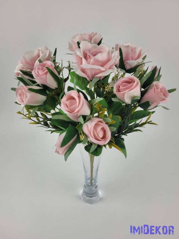 Rózsa + bimbó 7 ágú selyem csokor 31 cm - Rózsaszínes