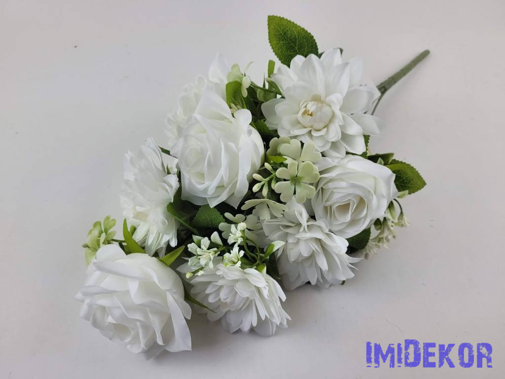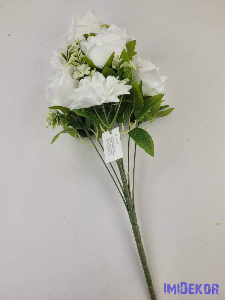 Féloldalas 9 ágú rózsa-dália selyemvirág csokor 50cm - Törtfehér