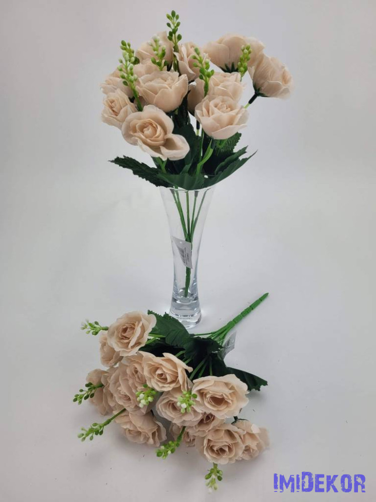Rózsa 14 fejes selyemvirág csokor díszítővel 30 cm - Sötét púder