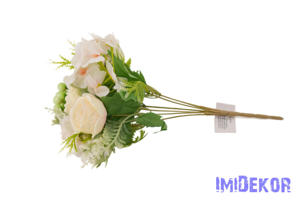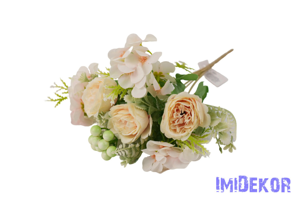 Peónia + hortenzia 7 ágú selyem csokor bogyóval 32cm - Krém-Rózsaszín