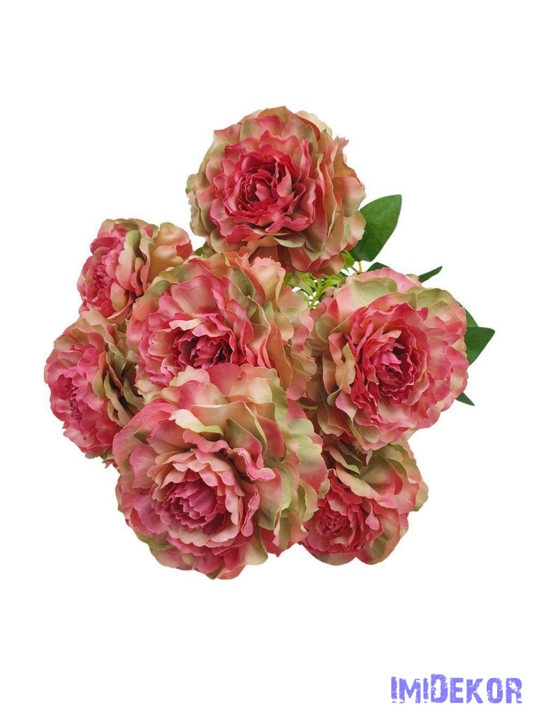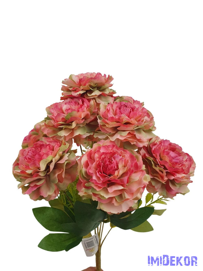 Fodros szirmú 9 nyílt fejes bazsarózsa csokor 42cm - Rózsaszín-Zöld